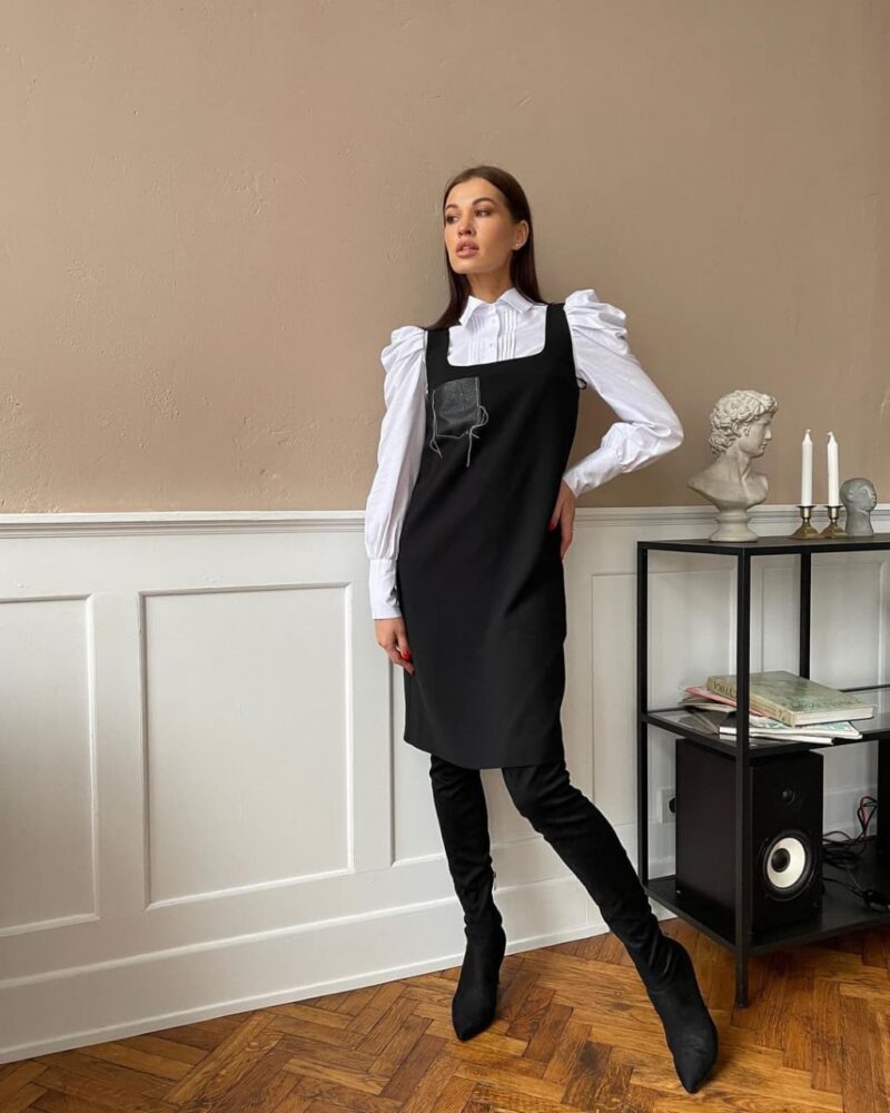 Представляем Вам сразу две новинки: белая рубашка с объёмными плечиками и чёрный сарафан с одним кармашком на груди