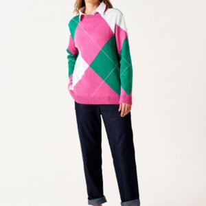 Брюки женские, свободного силуэта, прямые, из джинсовой ткани. Застежка брюк на тесьму-молнию спереди и петлю, пуговицу. Передние половинки брюк с боковыми карманами. Заднее полотнище брюк с прорезными карманами в рамку. Верхний срез брюк обработан притачным поясом с регулируемой патой на резинке.