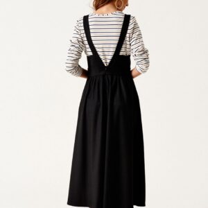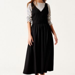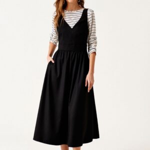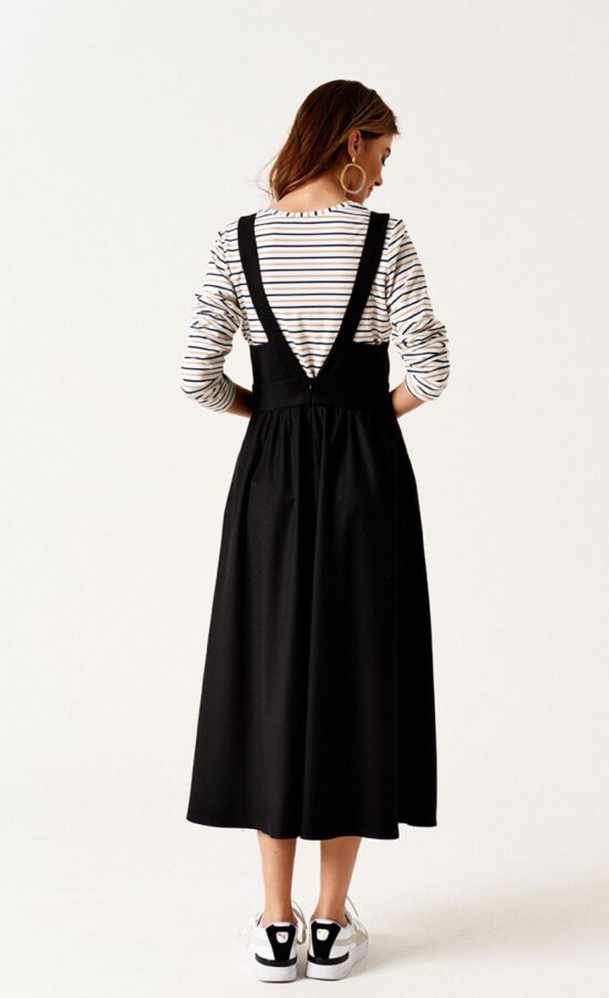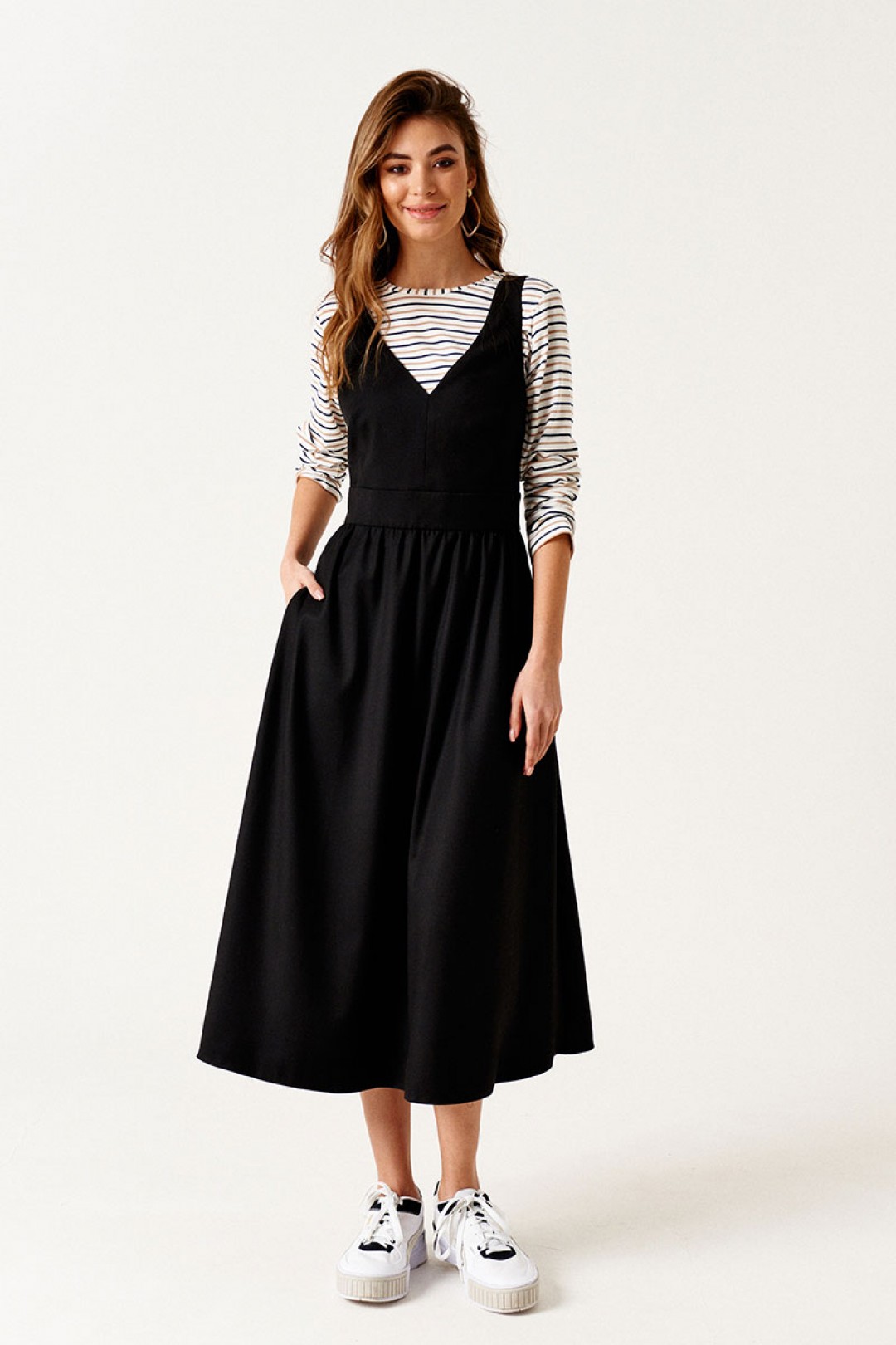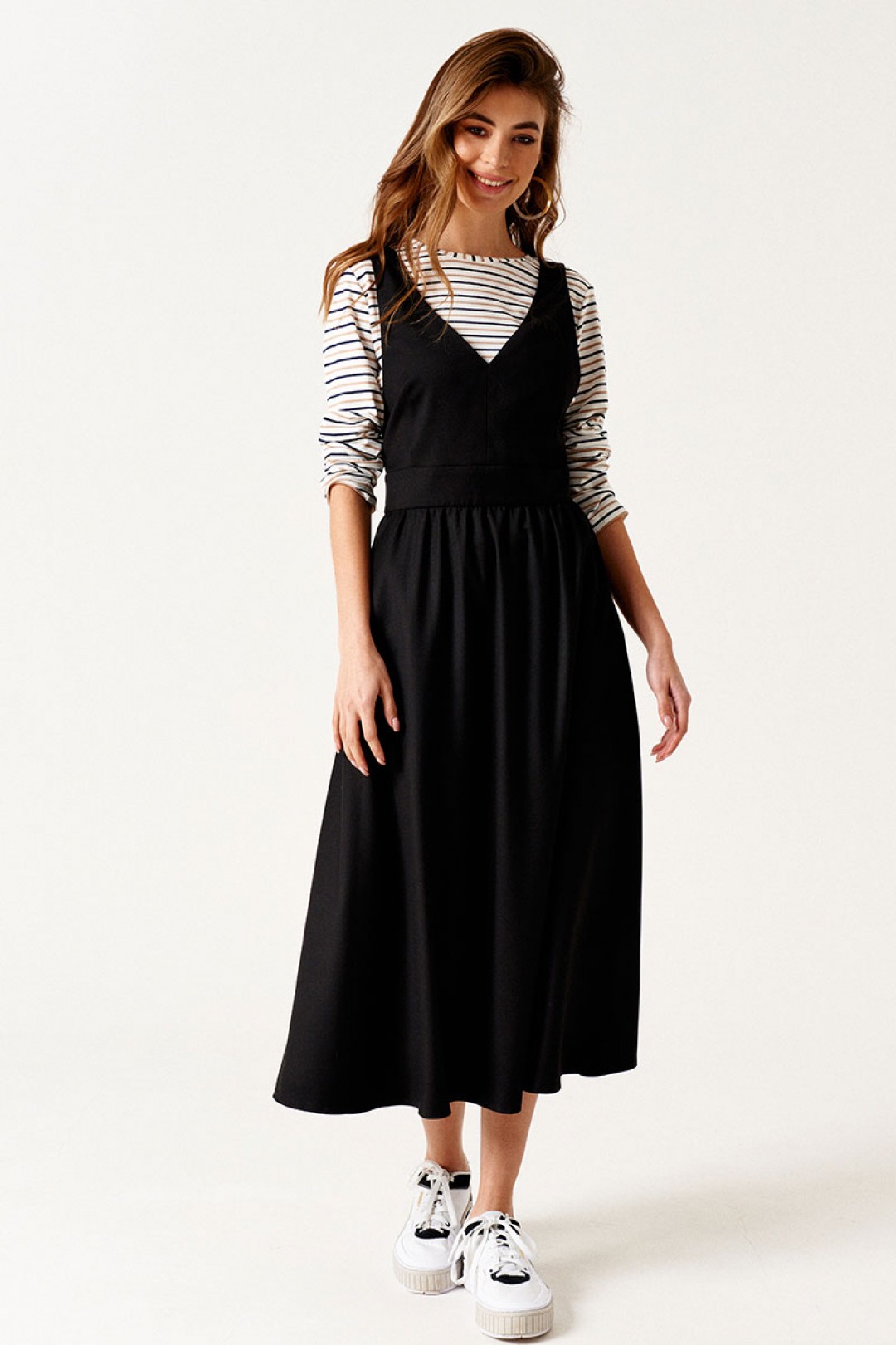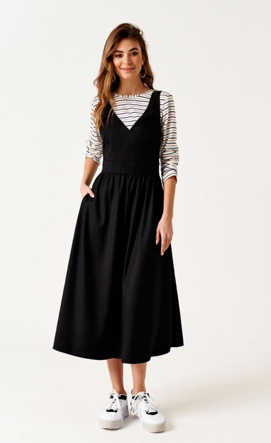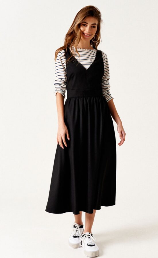 Сарафан приталенного силуэта, отрезной по линии талии, длиной ниже линии колен, из текстильной ткани. Перед с талиевыми вытачками. Верхняя часть сарафана обработана подкладкой. Спинка со средним швом. Застежка на потайную молнию в среднем шве спинки. Карманы в боковых швах.
