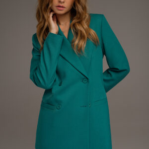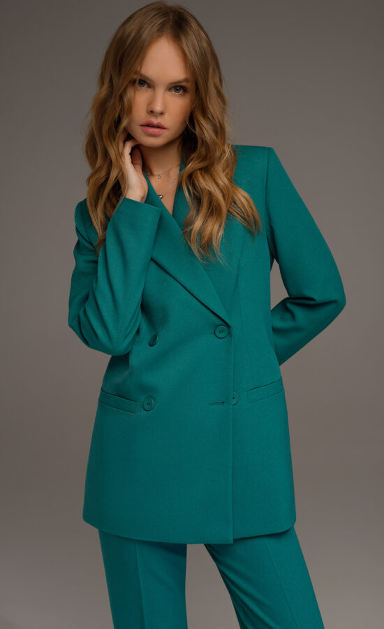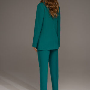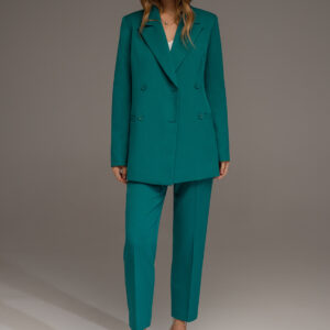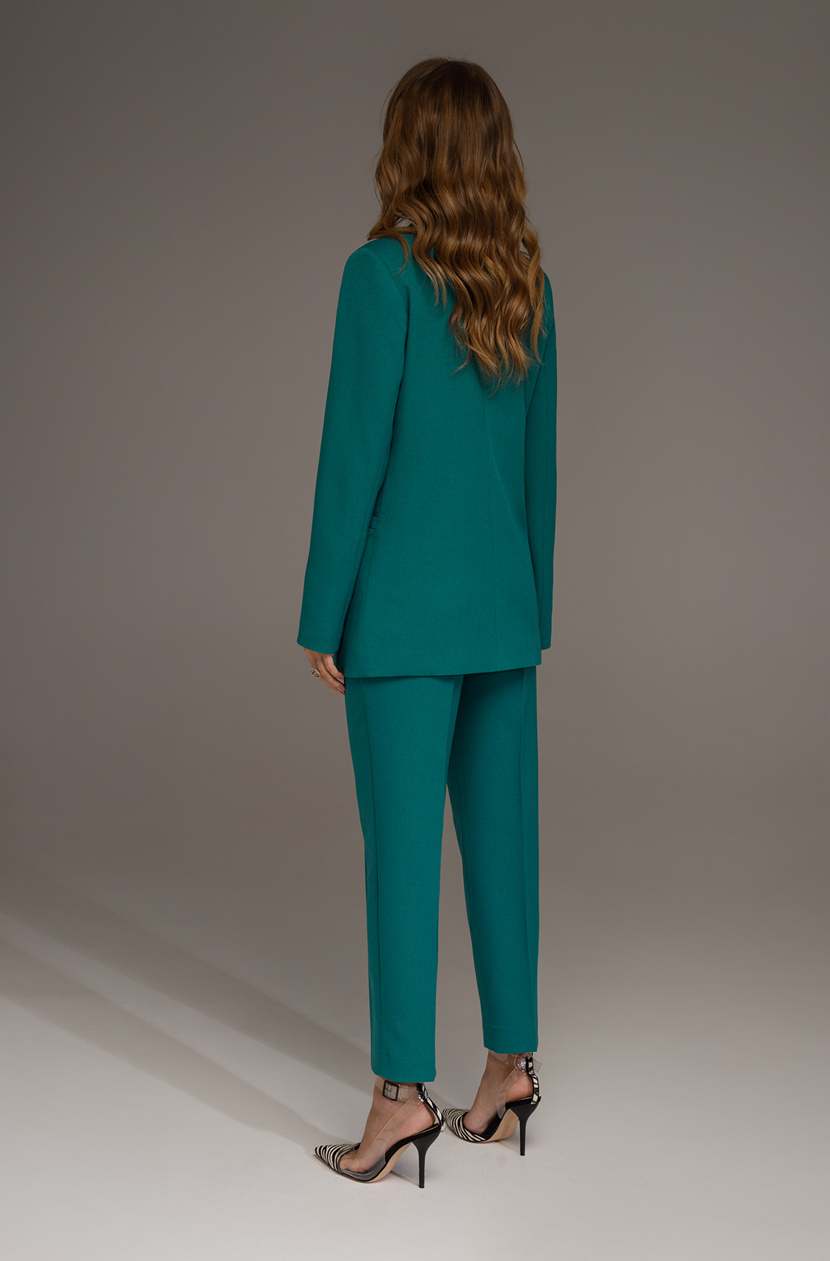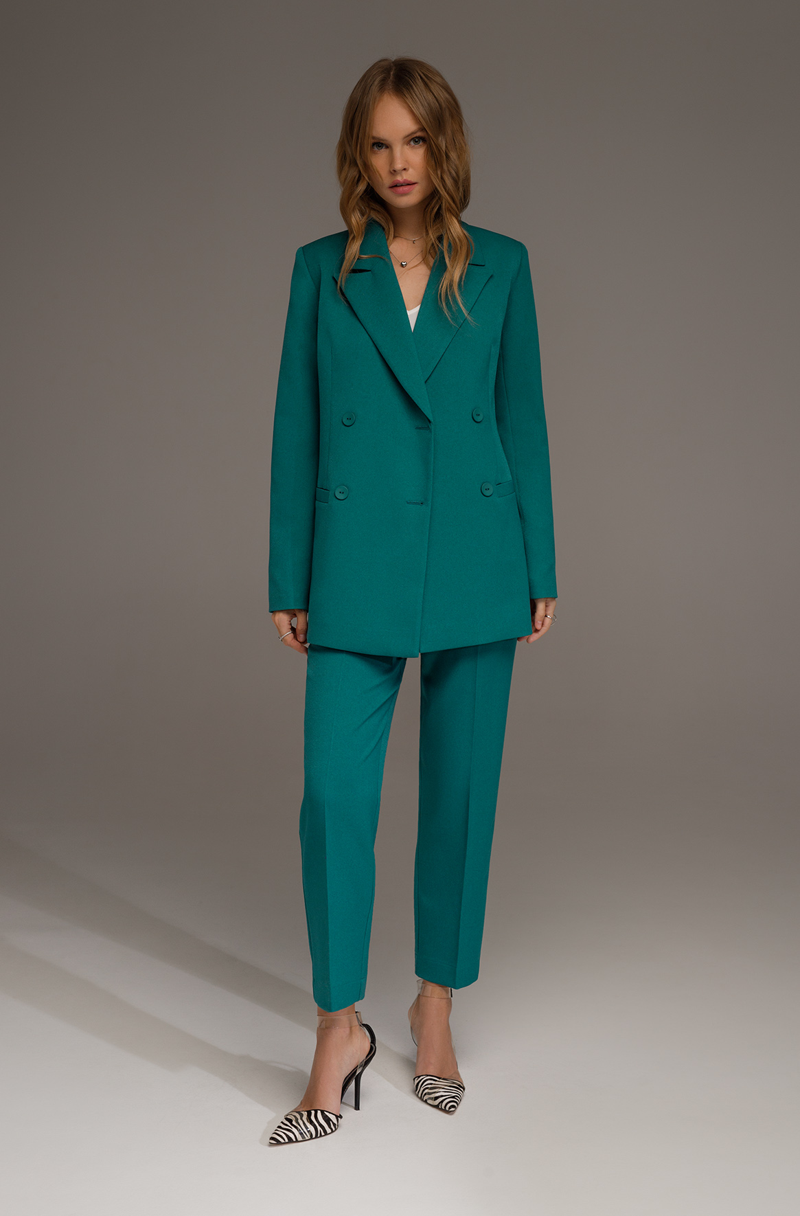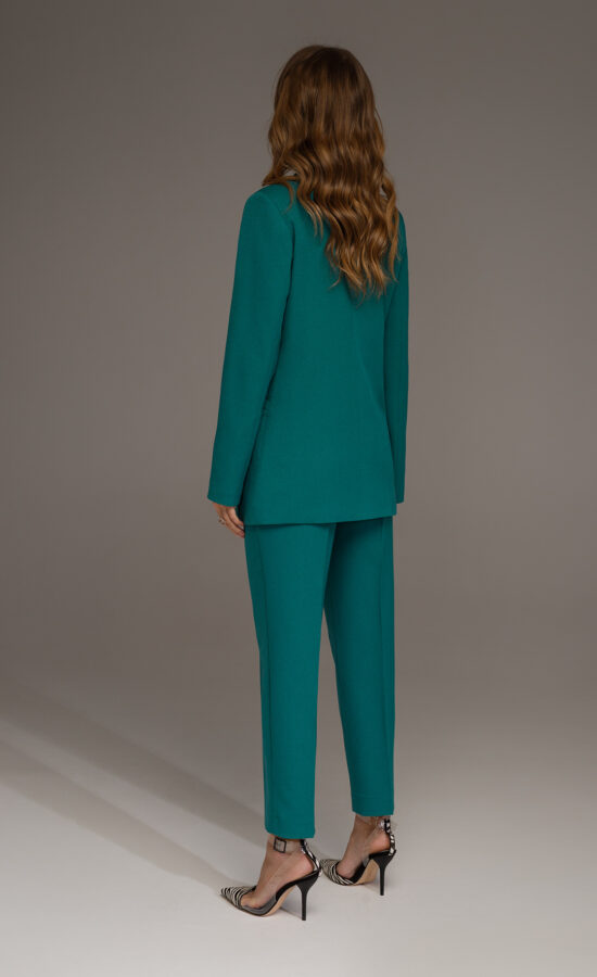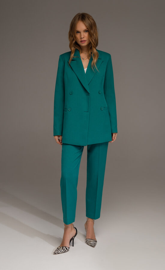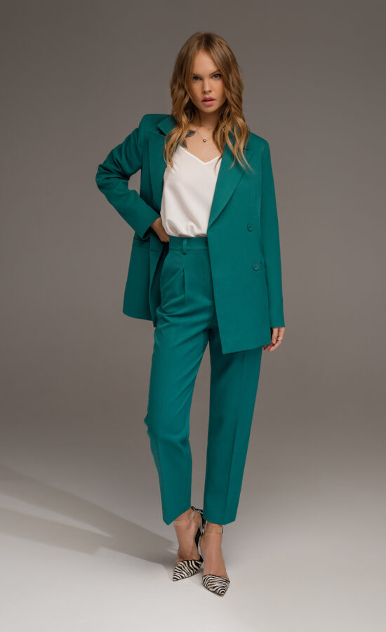 Текстильный костюм-двойка из свободного двубортного жакета и укороченных брюк с высокой посадкой. Детали: жакет прямого силуэта, пиджачный воротник, прорезные карманы с клапанами, спинка со средним швом, втачные двухшовные рукава, жакет на подкладке. Брюки с высокой посадкой на притачном поясе со шлевками, передние половины с небольшими застроченными мягкими складками и заутюженными стрелками, застежка на молнию и пуговицу, боковые карманы