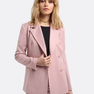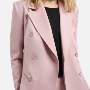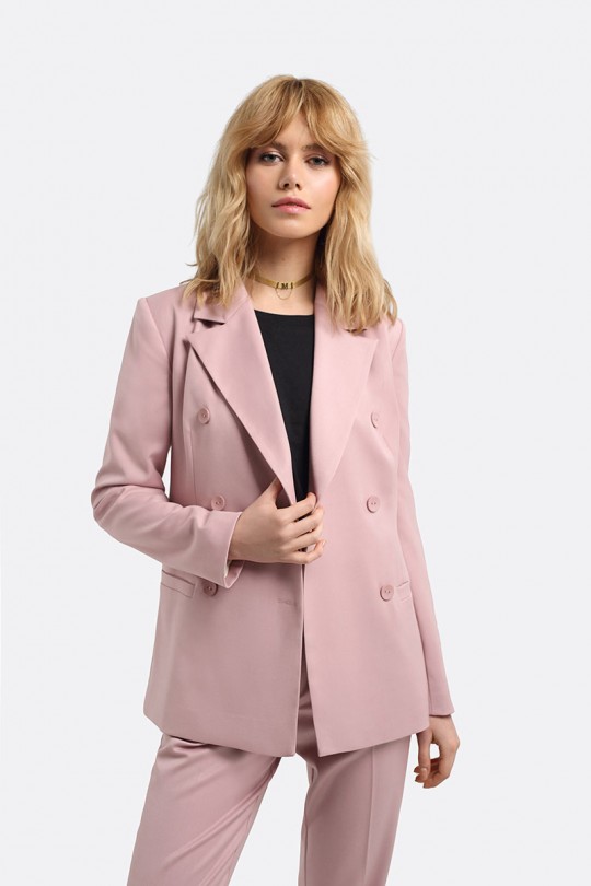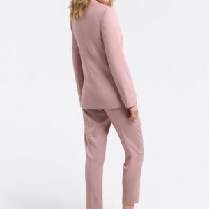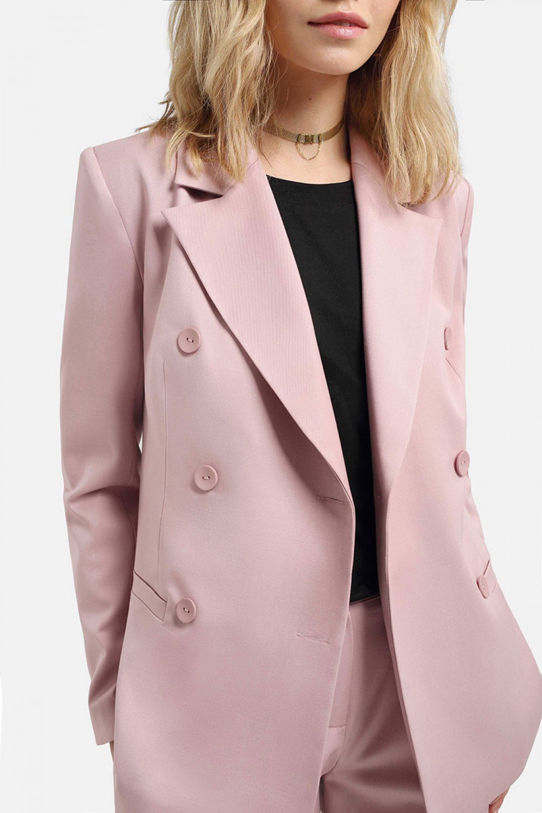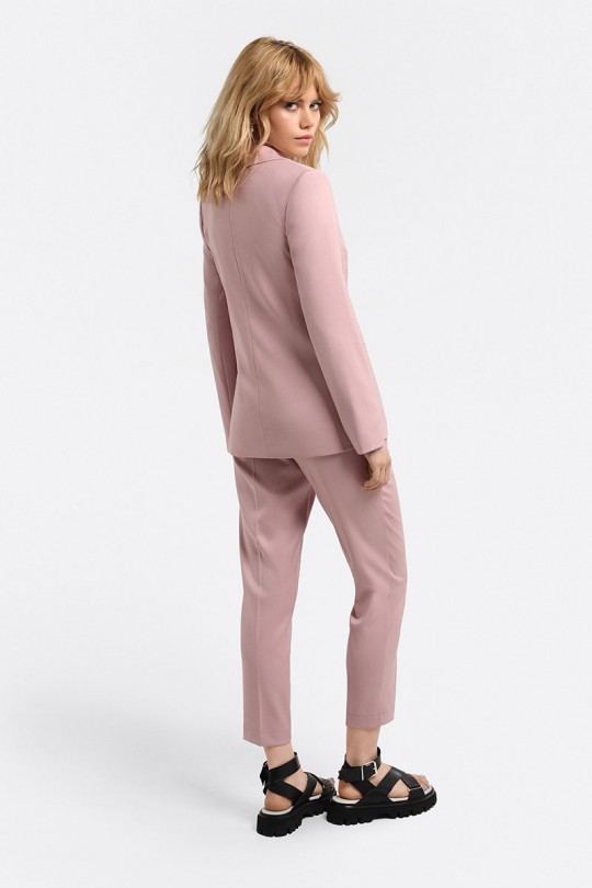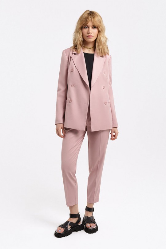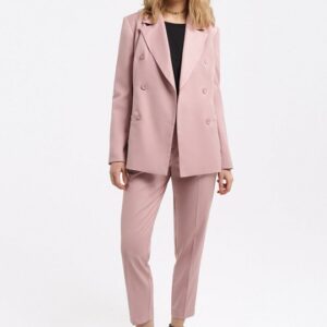 Текстильный костюм-двойка из двубортного жакета и укороченных брюк со стрелками. Детали: жакет прямого силуэта, пиджачный воротник, прорезные карманы, спинка со средним швом, втачные двухшовные рукава, на подкладке.