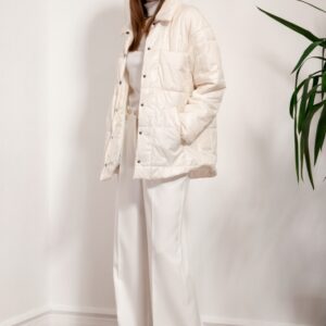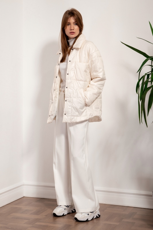 Куртка-рубашка из стеганой плащевой ткани на тонком утеплителе свободного силуэта со спущенной линией плеч, с центральной застежкой на кнопки. Воротник отложной на отрезной стойке по спинке. На переде 2 накладных нагрудных кармана и 2 прорезных наклонных кармана с широкими листочками. Низ фигурный.