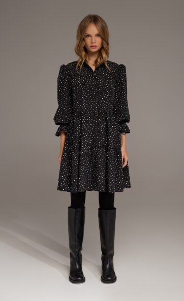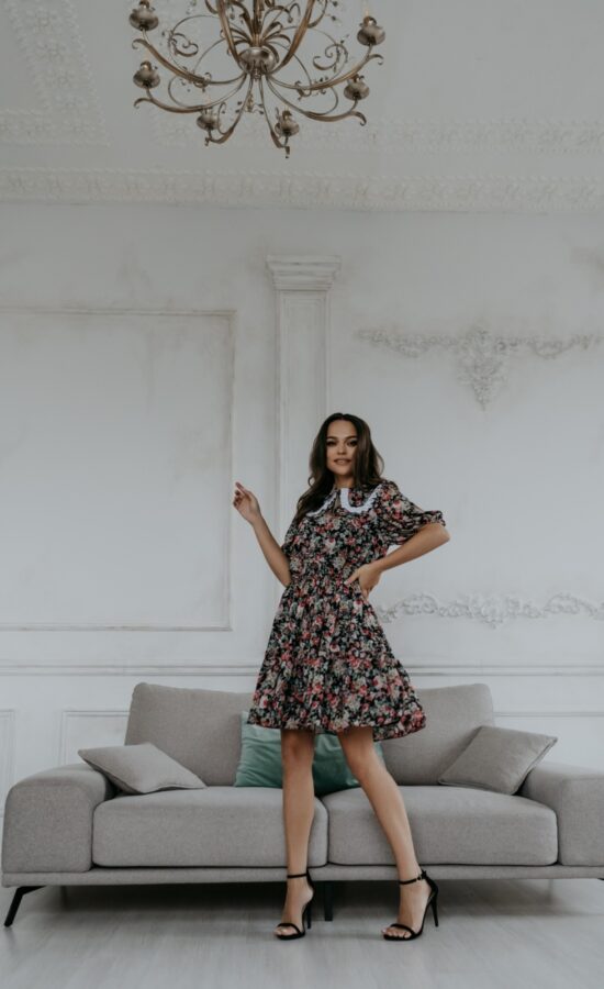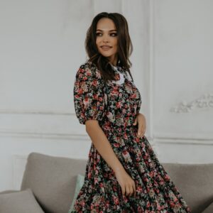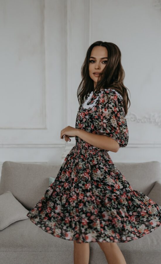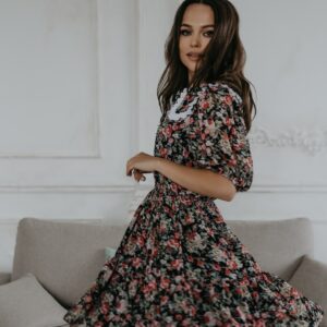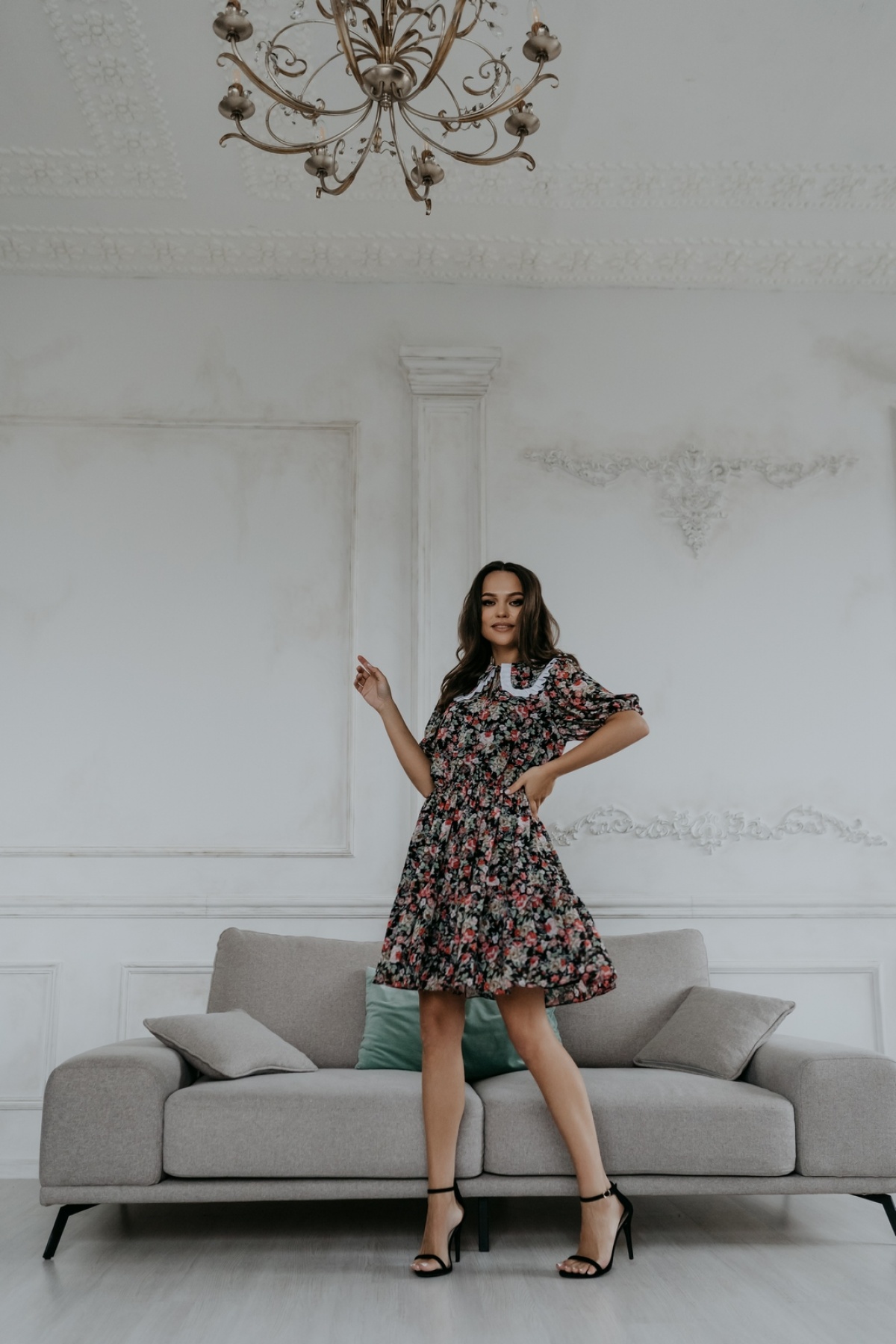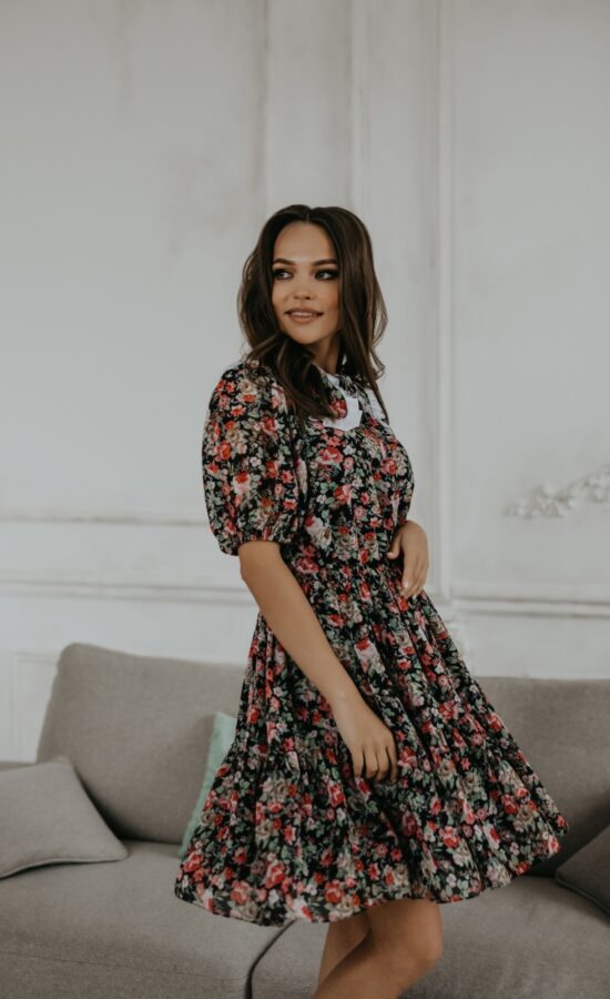 Платье на подкладке отрезное по талии с эластичной тесьмой, по низу платья притачной волан, рукав короткий, объемный, по низу рукава эластичная тесьма, горловина круглой формы со съемным воротником.