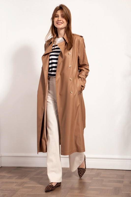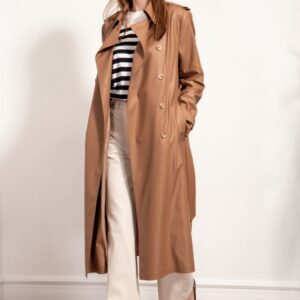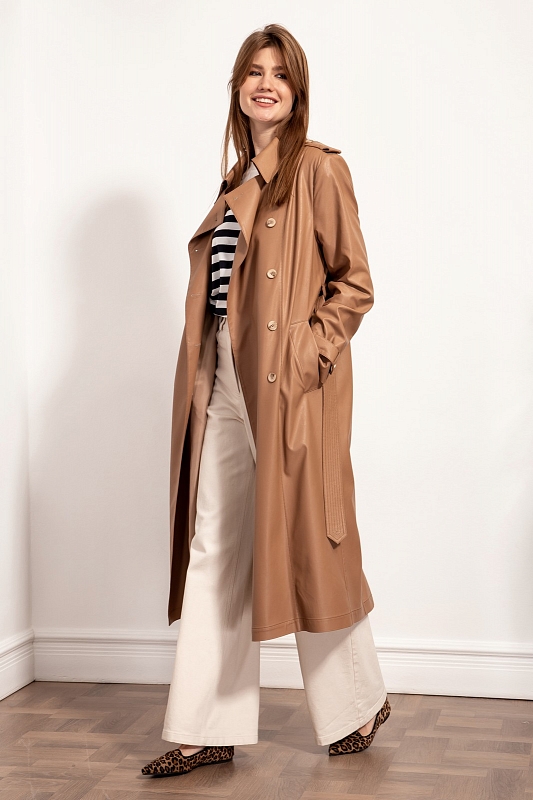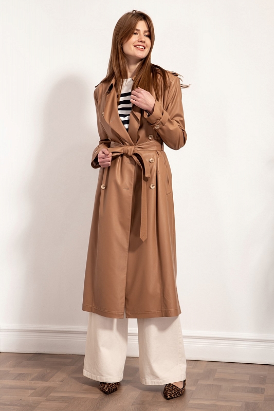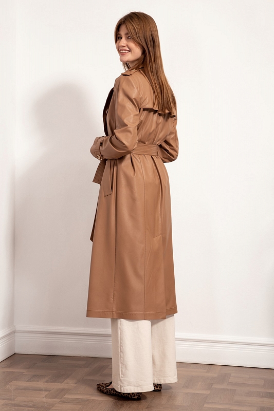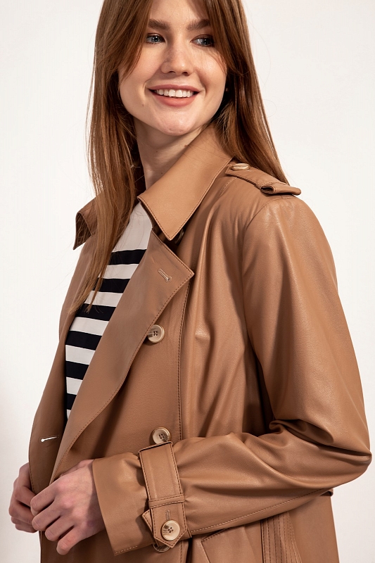 Стильный тренч из экокожи двубортный с застежкой на петли и пуговицы в натуральном стиле, с втачным покроем рукава с длинными со съемными патами, застегивающиеся на пуговицы. Воротник отложной, по плечам погоны с пуговицами. Перед с рельефами идущими от плеча до низа изделия. Карманы прорезные с широкими листочками. Спинка с боковыми рельефами, средним швом, заканчивающимся шлицей и отлетной кокеткой. Изделие на отлетной подкладке. Талия акцентируется съемным поясом из основной ткани с декоративными строчками.