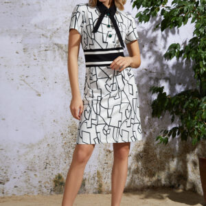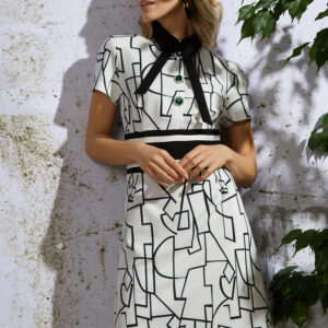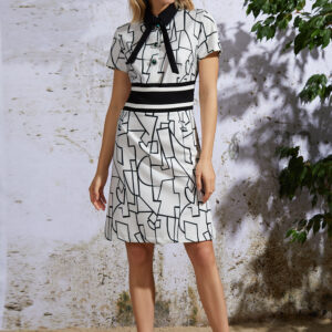 Летнее платье из тонкой стрейчевой костюмной ткани молочного цвета с принтом ”Геометрия” без подкладки. Изделие с застежкой по центру до линии талии на три декоративные пуговицы. Дополнительная потайная кнопка на стойке горловины. Молния в боковом шве. По талии отрезной декоративный пояс. Лиф с нагрудными и талиевыми выточками. Низ платья А-образный. Изделие до колена. Спинка со средним швом и выточками. На спинке подреза и декоративного пояса нет. Горловина – рубашечный воротник со стойкой . Рукав втачной короткий. Дополнительная ленточка – бант в комплекте.