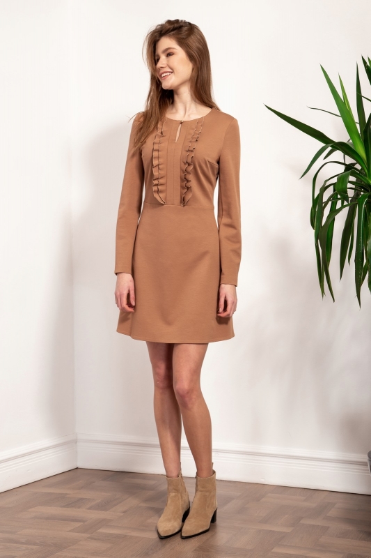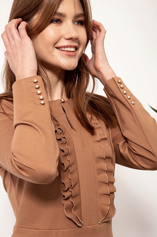 Романтическое платье из трикотажа, отрезное по линии талии. Лиф декорирован небольшим разрезом и рюшами вдоль планок. Рукава втачные длинные с застежкой на пуговицы по низу. Юбка А-силуэта.