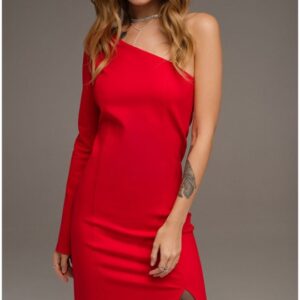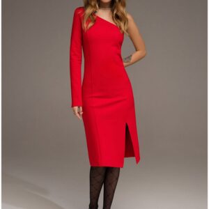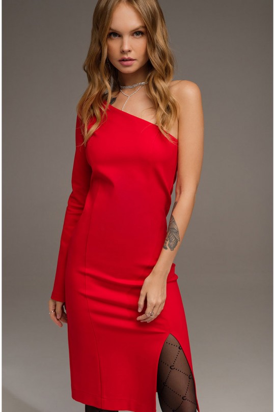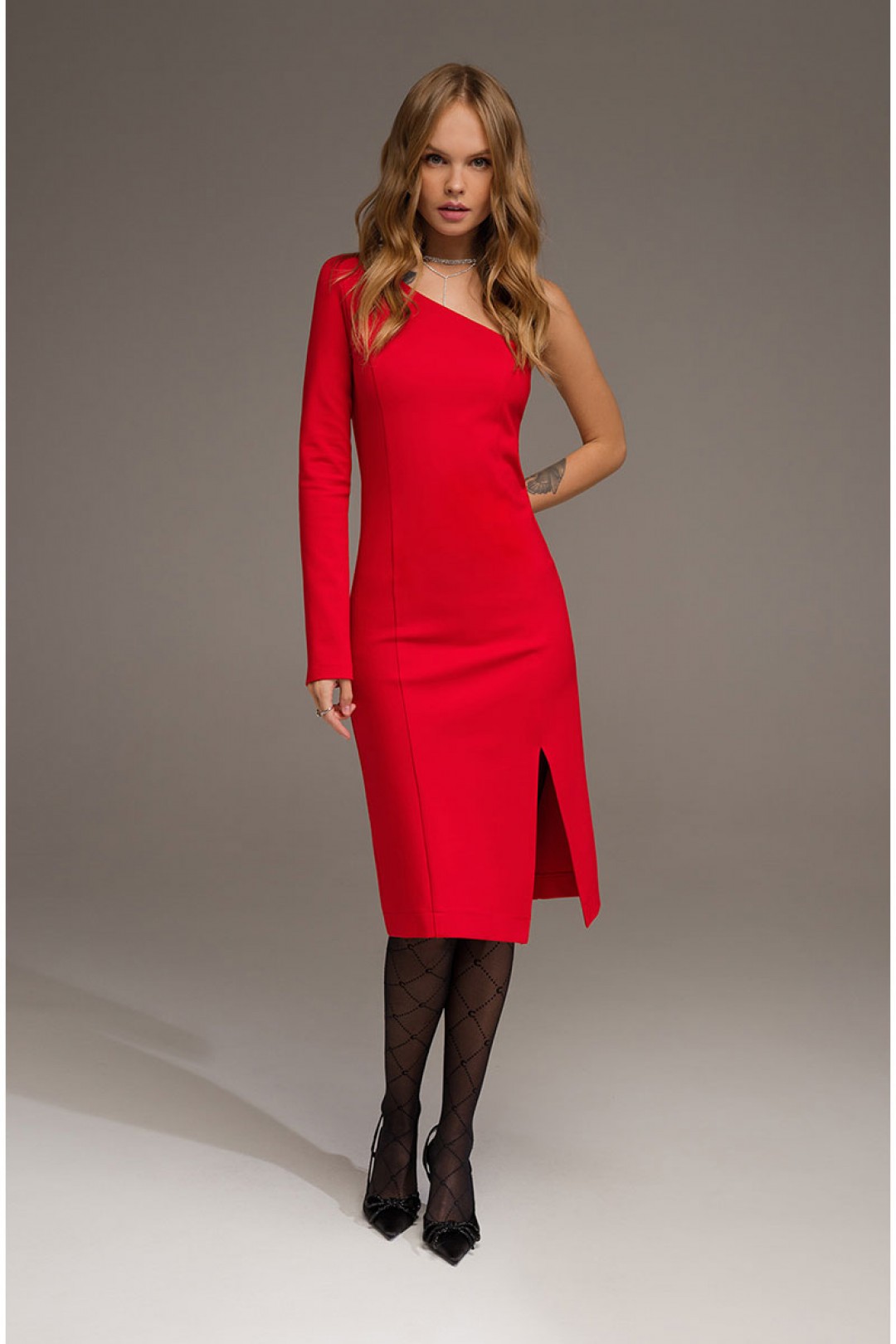 Асимметричное облегающее миди-платье из плотного трикотажа. Детали: прилегающий силуэт, рельефные швы переда и спинки, втачной длинный рукав, фигурный разрез.