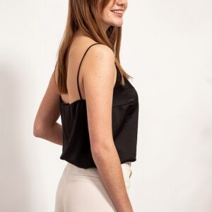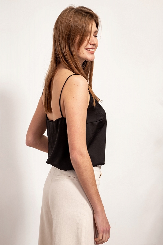 Базовый топ в бельевом стиле на бретелях прямого силуэта из струящейся шелковой ткани. Вырез горловины V-образный.