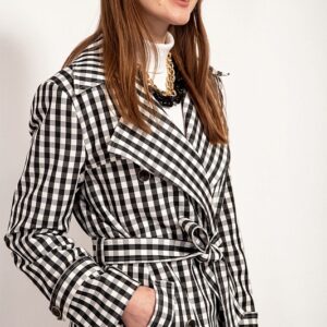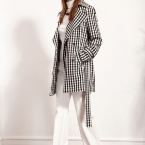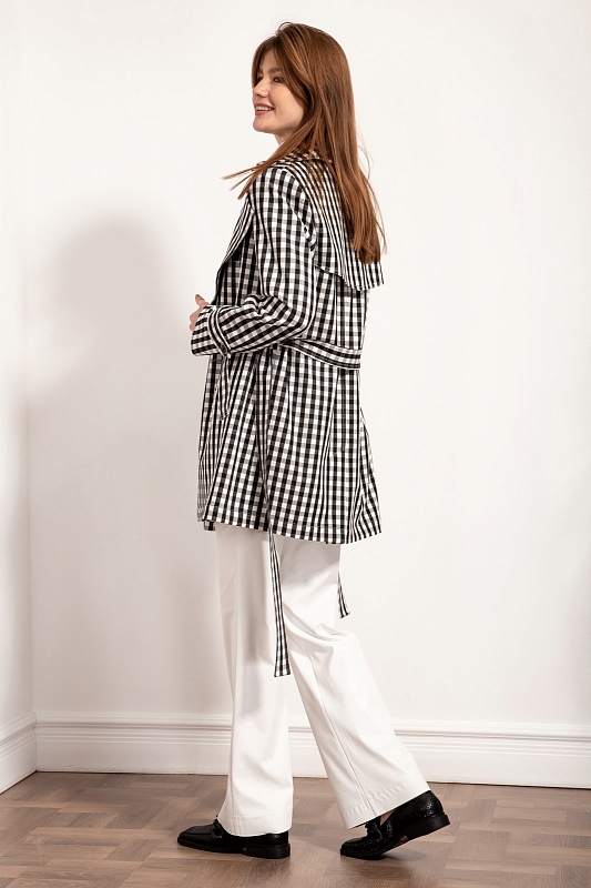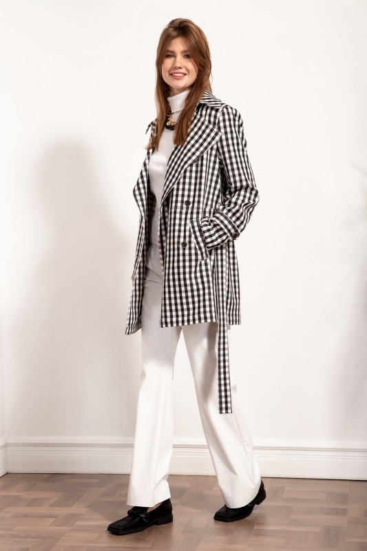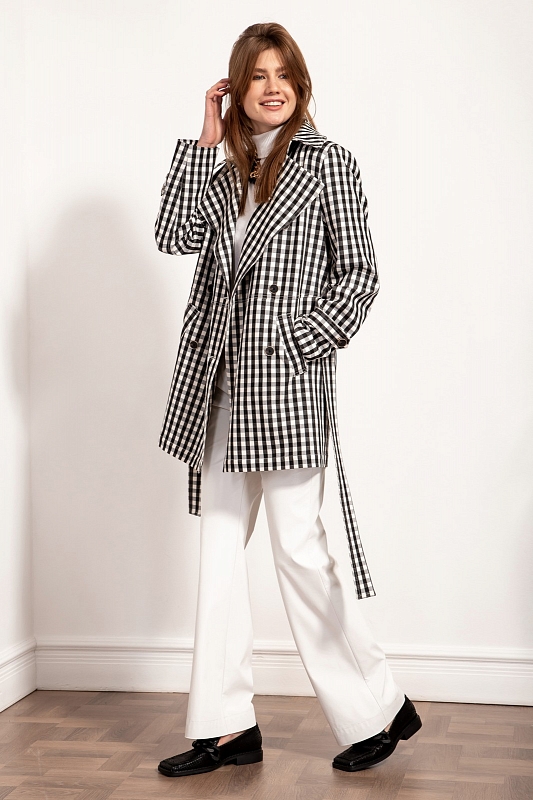 Тренч из поливискозной костюмной ткани с дизайном в клетку двубортный с застежкой на петли и пуговицы в натуральном стиле, с втачным покроем рукава с декоративными патами, застегивающиеся на пуговицы. Воротник отложной, на отрезной стойке с цельнокроеными отложными лацканами. Перед с отлетной кокеткой. Карманы прорезные с широкими листочками. Спинка со средним швом, заканчивающимся шлицей и отлетной кокеткой. Изделие на отлетной подкладке по низу. Талия акцентируется съемным поясом из основной ткани.