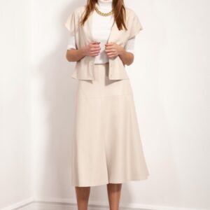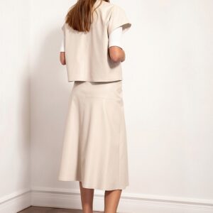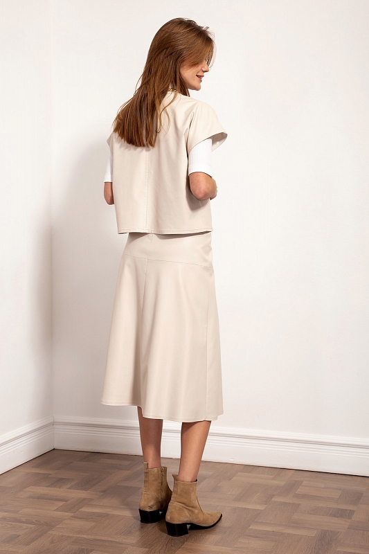 Юбка А-силуэта из экокожи с горизонтальным подрезом в области бедер и со средним швом и разрезом по низу спереди. Застежка на потайную молнию в среднем шве сзади. Юбка на подкладке с содержанием вискозы.
