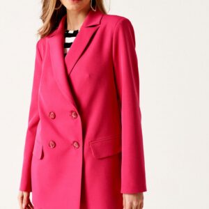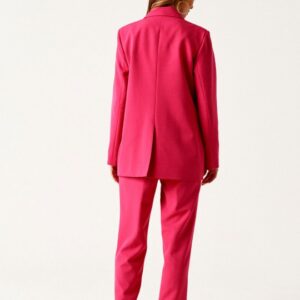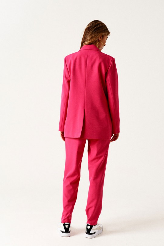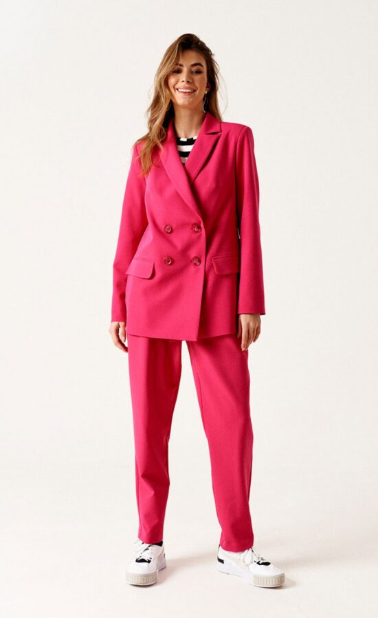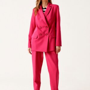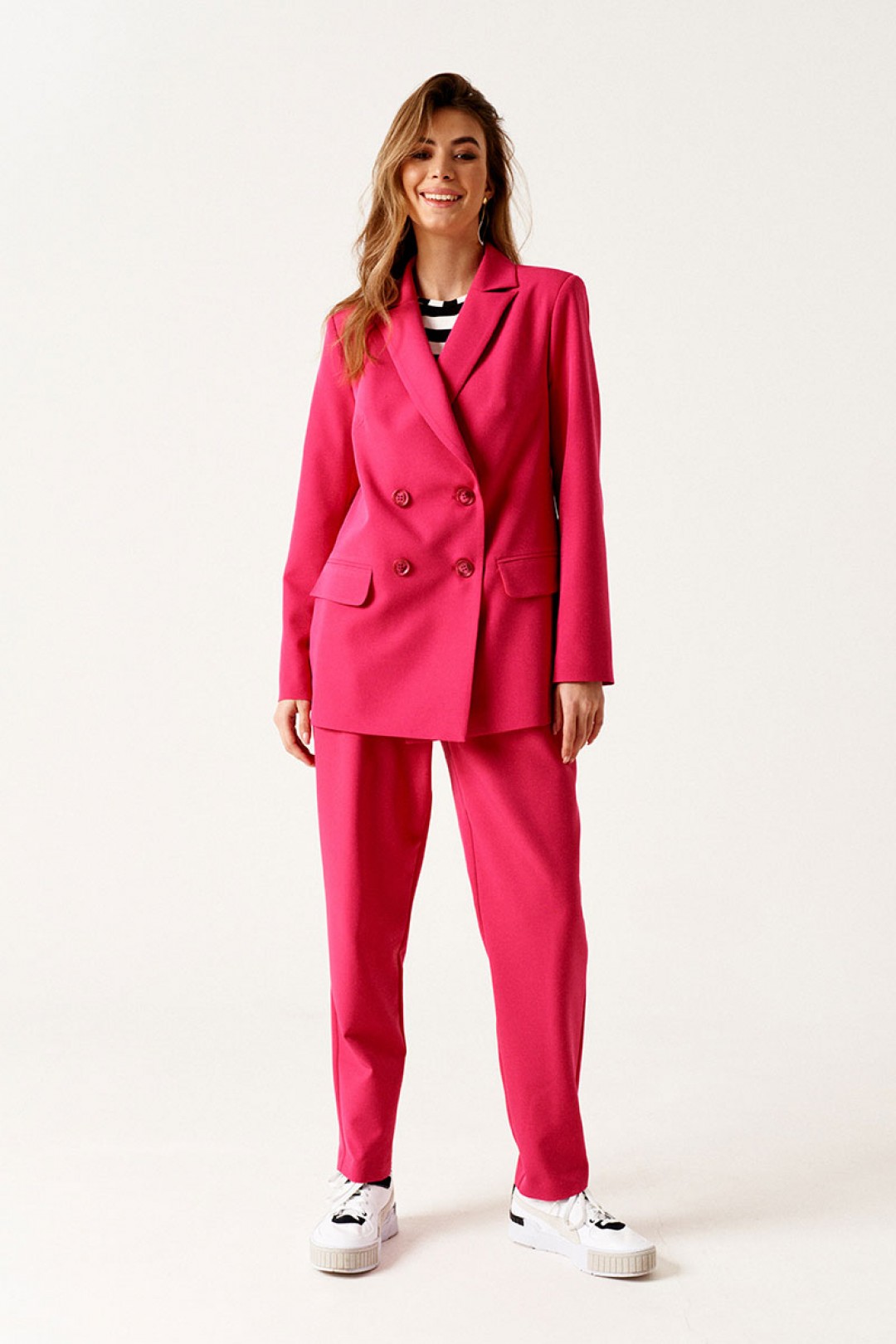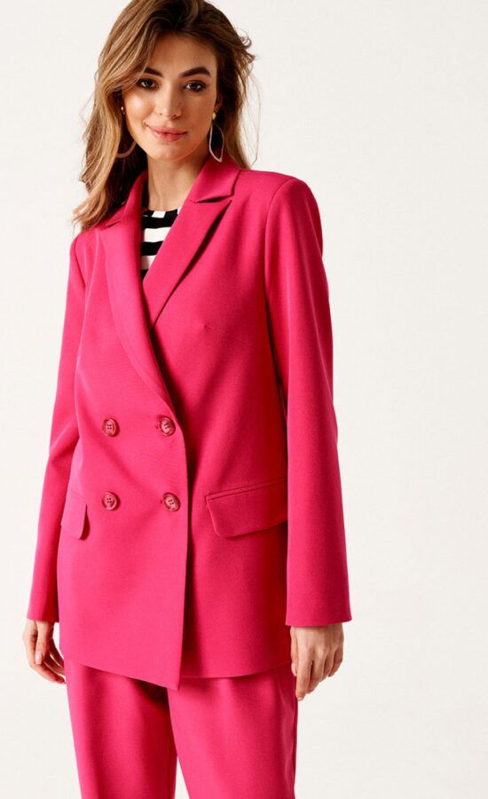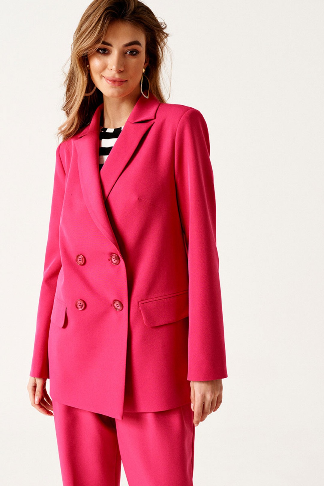 Жакет женский двубортный, свободного силуэта, длиной ниже линии бедер, из костюмной ткани. Перед с двубортной застежкой на петли, пуговицы, с нагрудными вытачками, прорезными карманами в рамку с клапаном. Спинка с центральным швом заканчивающийся шлицей. Рукав втачной, двухшовный, длинный. Воротник отложной пиджачного типа. Жакет на подкладке.