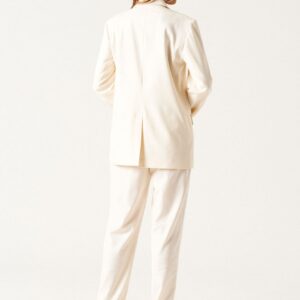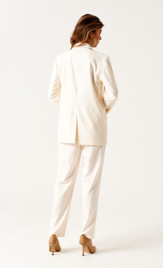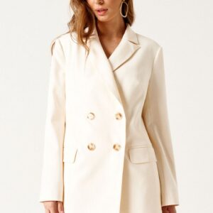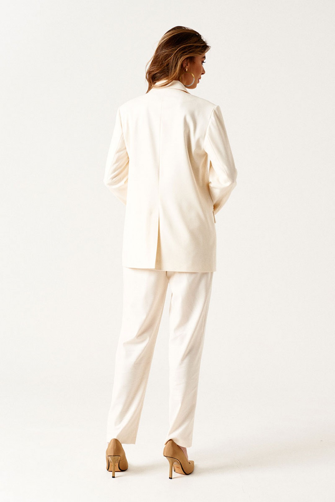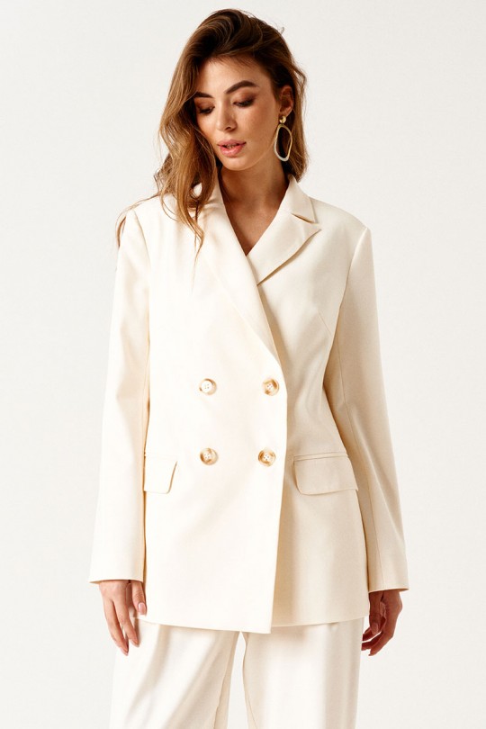 Жакет женский двубортный, свободного силуэта, длиной ниже линии бедер, из костюмной ткани. Перед с двубортной застежкой на петли, пуговицы, с нагрудными вытачками, прорезными карманами в рамку с клапаном. Спинка с центральным швом заканчивающийся шлицей. Рукав втачной, двухшовный, длинный. Воротник отложной пиджачного типа. Жакет на подкладке.