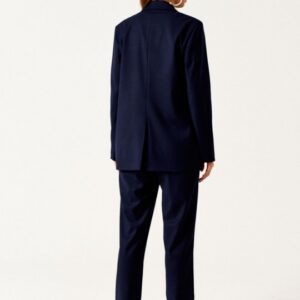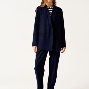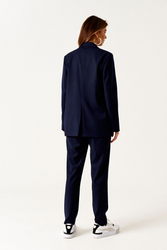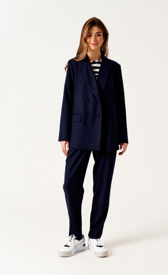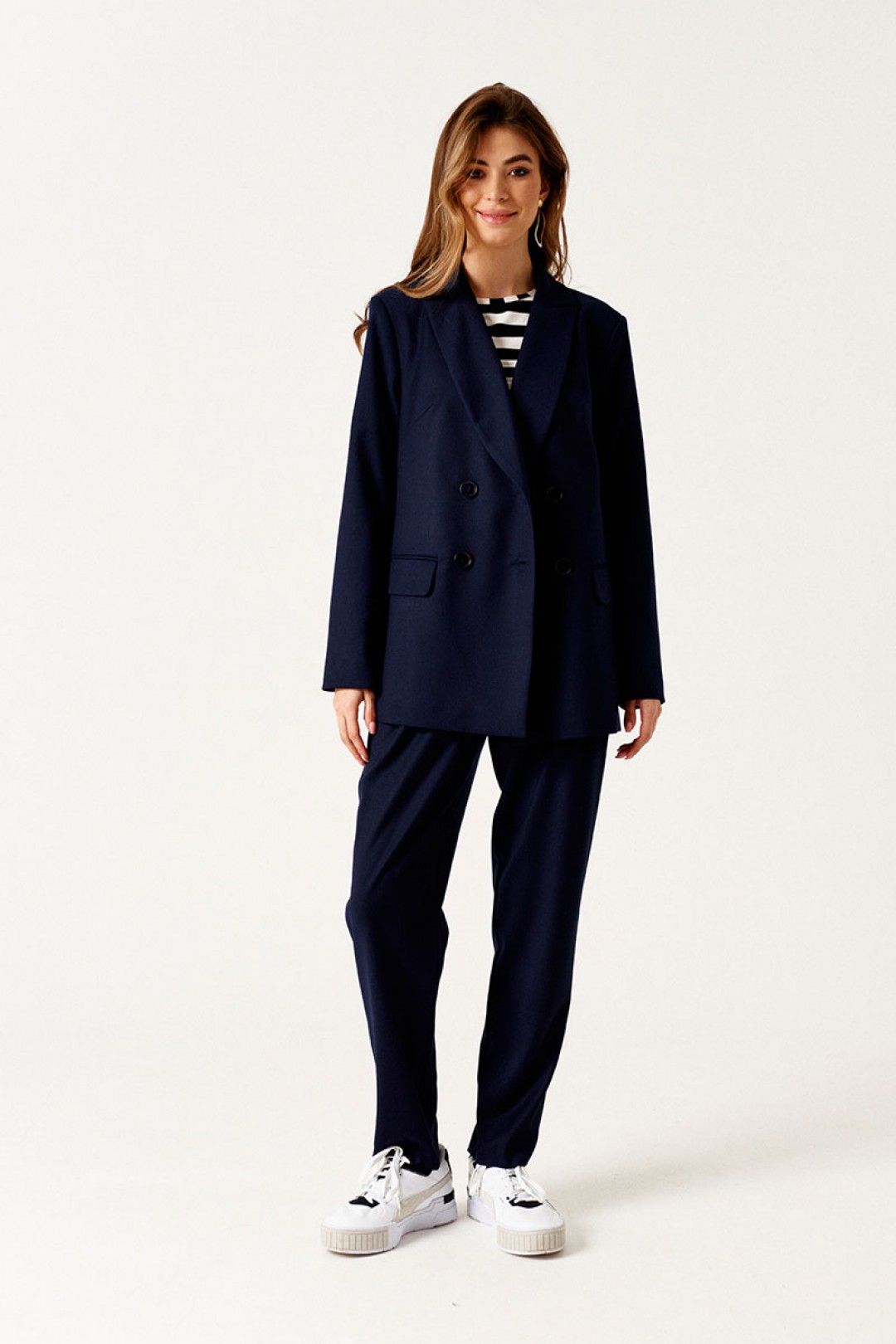 Жакет женский двубортный, свободного силуэта, длиной ниже линии бедер, из костюмной ткани. Перед с двубортной застежкой на петли, пуговицы, с нагрудными вытачками, прорезными карманами в рамку с клапаном. Спинка с центральным швом заканчивающийся шлицей. Рукав втачной, двухшовный, длинный. Воротник отложной пиджачного типа. Жакет на подкладке.